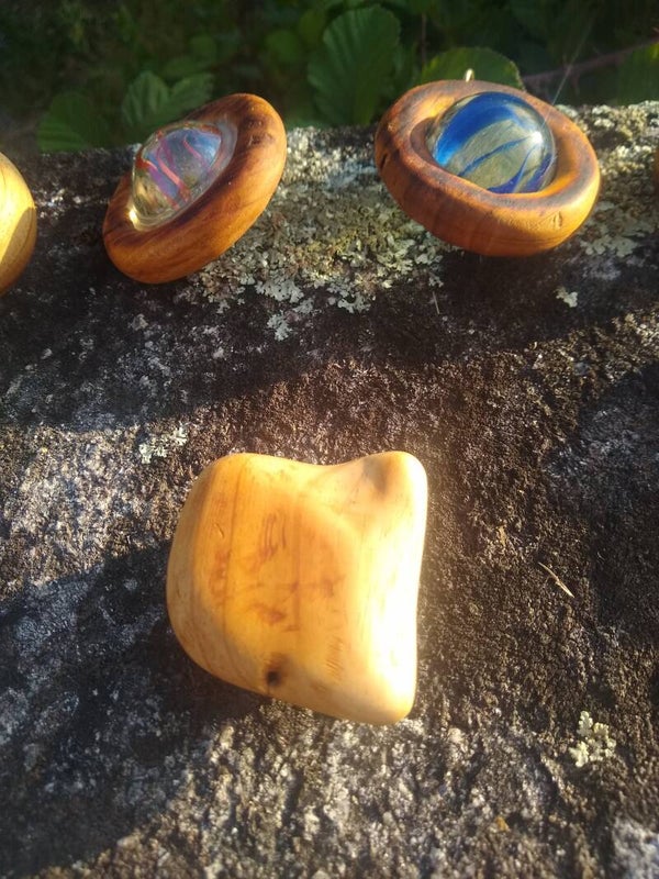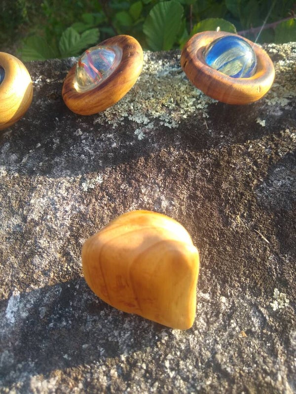 Yellow on green glass textured marble is embedded into a freeform carved two tone wooden fidget, perfect for gripping tight or simply playing with to help reduce stress.